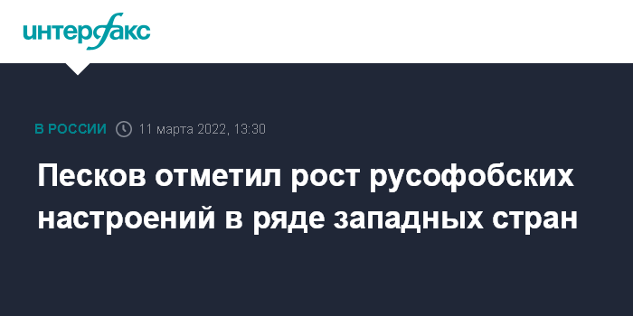 Москва. 11 марта. INTERFAX.RU - Пресс-секретарь президента России Дмитрий Песков назвал опасным рост русофобских настроений в ряде западных стран.