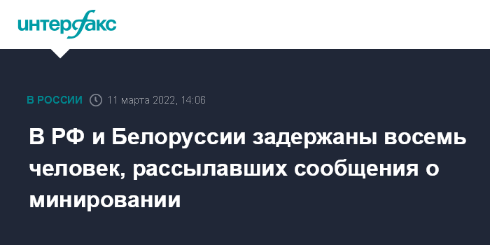 Москва. 11 марта. INTERFAX.RU - Восемь участников интернет-сообщества, занимавшегося массовыми рассылками анонимных сообщений об угрозах взрыва с декабря минувшего года, задержаны в России и Белоруссии, сообщает Центр общественных связей (ЦОС) ФСБ.