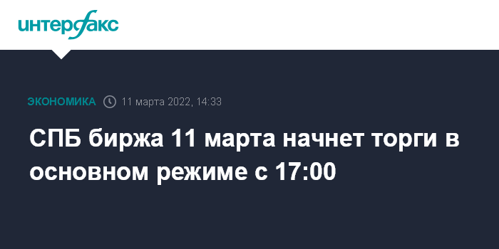 СПБ биржа 11 марта начнет торги в основном режиме с 17:00