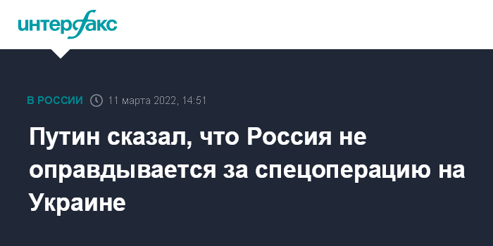 Москва. 11 марта. INTERFAX.RU - Россия не оправдывается за спецоперацию на Украине, сказал президент РФ Владимир Путин на переговорах со своим белорусским коллегой Александром Лукашенко.