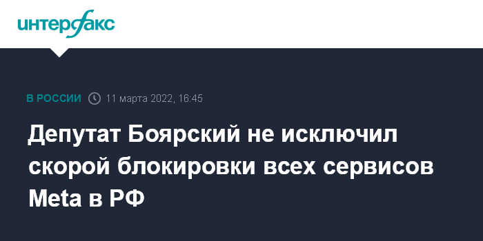 Москва. 11 марта. INTERFAX.RU - Первый заместитель председателя Комитета по информполитике, информтехнологиям и связи Сергей Боярский заявил, что в ближайшее время в России будут заблокированы все сервисы компании Meta.