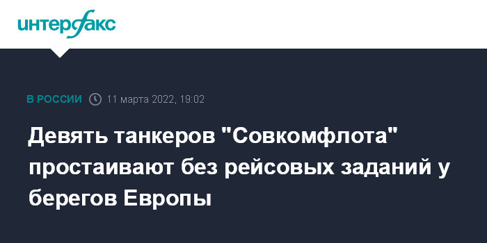 Москва. 11 марта. INTERFAX.RU - Девять судов "Совкомфлота" типоразмера "Афрамакс" замечены на стоянке в море, большинство из них находятся у берегов Европы после выгрузки грузов, сообщило агентство Bloomberg.