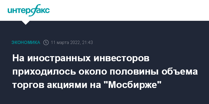 Москва. 11 марта. INTERFAX.RU - В акциях и производных финансовых инструментах иностранные инвесторы генерировали почти 50% объемов в обычное время, заявил директор по связям с инвесторами "Московской биржи" Антон Терентьев на конференц-колле, посвященном результатам IV квартала 2021 года.