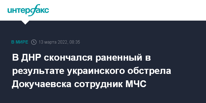 Москва. 13 марта. INTERFAX.RU - Скончался один из десяти спасателей, пострадавших в результате обстрела части МЧС в ДНР в субботу, сообщает штаб территориальной обороны Донецкой народной республики.