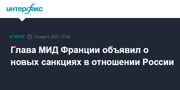 Москва. 13 марта. INTERFAX.RU - Министр иностранных дел Франции Жан-Ив Ле Дриан отметил "размах последствий санкций", вводимых ЕС против России, и объявил новый пакет ограничительных мер, которые, по его словам, начнут действовать с этого воскресенья.