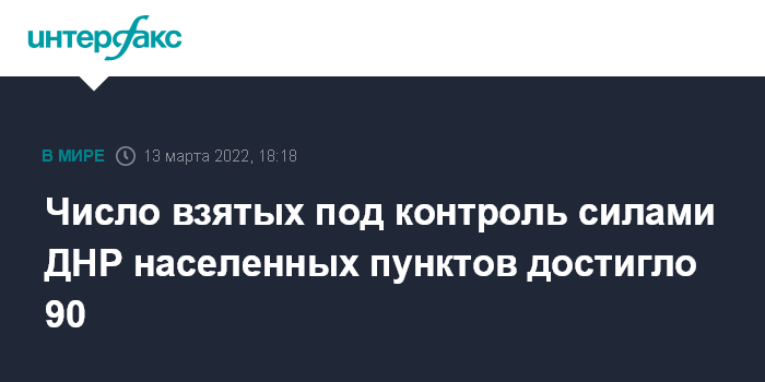 "По состоянию на вечер 13 марта 2022 г. группировка войск ДНР освободила 90 населенных пунктов, включая Ивановку", - говорится в сообщении, распространённом штабом территориальной обороны ДНР в воскресенье.