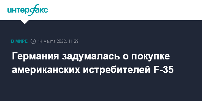 Москва. 14 марта. INTERFAX.RU - Власти Германии планируют приобрести до 35 американских истребителей F-35. Об этом сообщает агентство DPA со ссылкой на источник в правительстве.