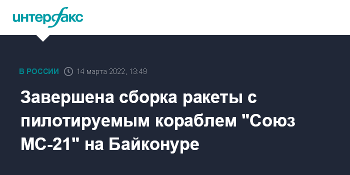 "На космодроме Байконур завершена общая сборка ракеты космического назначения в составе ракеты-носителя "Союз-2.1а" и пилотируемого корабля "С. П. Королёв" ("Союз МС-21")", - говорится в сообщении госкорпорации в телеграме.