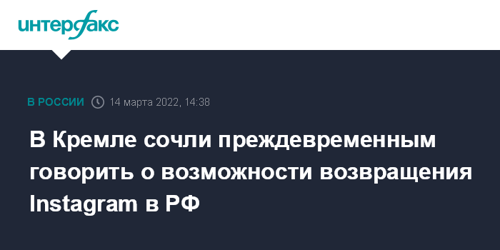Москва. 14 марта. INTERFAX.RU - Пресс-секретарь президента России Дмитрий Песков заявил, что несмотря на попытки Meta дистанцироваться от ранее сделанных заявлений по поводу своих подходов к модерации, пока вряд ли можно говорить о снятии блокировок с продуктов компании, включая Instagram.