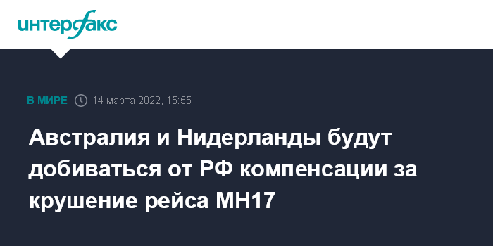 Москва. 14 марта. INTERFAX.RU - Австралия и Нидерланды намерены через Международную организацию гражданской авиации добиваться компенсации от РФ по делу о крушении в Донбассе летом 2014 года "Боинга" Malaysia Airlines, следовавшего рейсом MH17 из Амстердама в Куала-Лумпур, сообщила газета The Guardian.