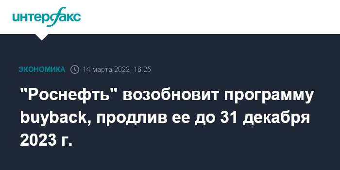 Москва. 14 марта. INTERFAX.RU - Совет директоров "Роснефти" решил возобновить программу buyback, продлив срок ее реализации до 31 декабря 2023 года, говорится в сообщении компании.