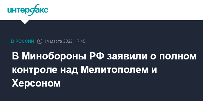 Москва. 14 марта. INTERFAX.RU - Украинские города Мелитополь и Херсон находятся под полным контролем российской стороны, гуманитарные грузы от киевских властей там не требуются, заявил начальник Национального центра управления обороной (НЦУО) РФ Михаил Мизинцев.