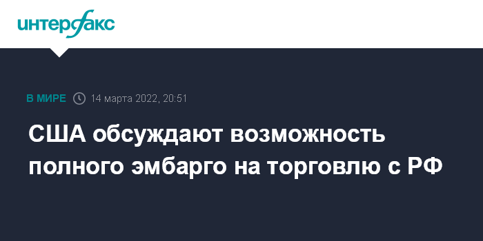 Москва. 14 марта. INTERFAX.RU - США в рамках новых санкций против РФ не исключают возможность полного эмбарго на торговлю с Россией, передает телеканал CNBC со ссылкой на заместителя министра финансов США Уолли Адейемо.