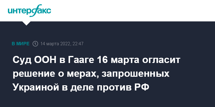Москва. 14 марта. INTERFAX.RU - Международный суд ООН огласит решение о временных ограничительных мерах, запрошенных Украиной по иску против России, 16 марта.