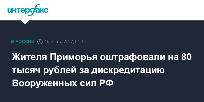 Москва. 15 марта. INTERFAX.RU - Суд во Владивостоке оштрафовал местного жителя за дискредитацию Вооруженных сил РФ, сообщила во вторник пресс-служба управления МВД Приморского края.
