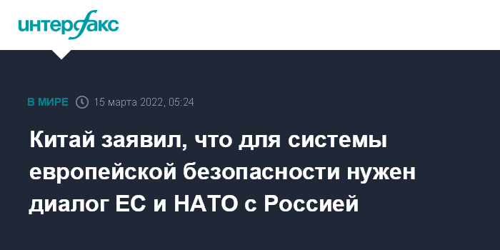 "Ван И подчеркнул, что за украинским кризисом стоит обострение противоречий в сфере европейской безопасности, которые накапливались годами. Для достижения долгосрочной стабильности в Европе Евросоюзу, НАТО и России необходимо вступить в равноправный диалог и создать сбалансированную, эффективную и устойчивую систему безопасности", - говорится в сообщении МИД КНР о беседе Ван И с главой МИД Индонезии Ретно Марсуди.