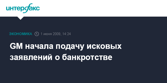 Нью-Йорк. 1 июня. ИНТЕРФАКС-АФИ - Крупнейший автопроизводитель США General Motors (GM) в понедельник начал подачу исковых заявлений о банкротстве, сообщило агентство Bloomberg.