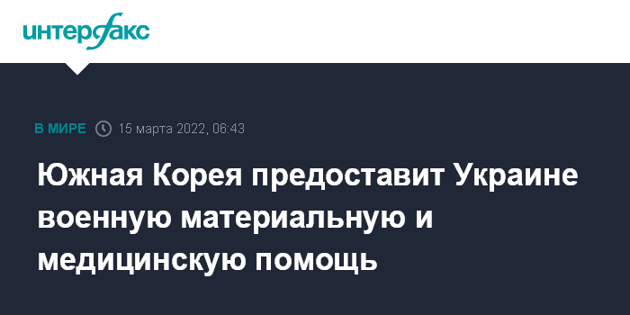 Москва. 15 марта. INTERFAX.RU - Южная Корея предоставит Украине военную помощь нелетального характера, такую как пуленепробиваемые шлемы и одеяла, а также предметы медицинского назначения, сообщает агентство "Ренхап".