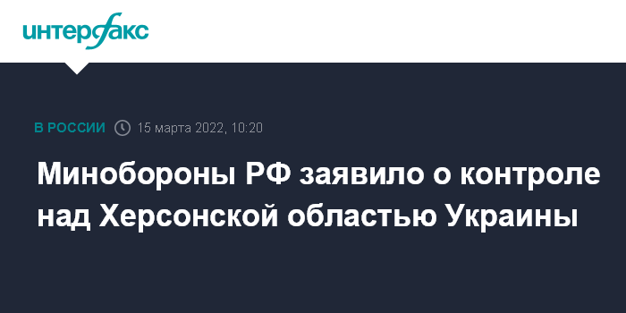 Москва. 15 марта. INTERFAX.RU - Российские военные взяли под контроль Херсонскую область Украины, сказал официальный представитель Минобороны РФ Игорь Конашенков на брифинге во вторник.