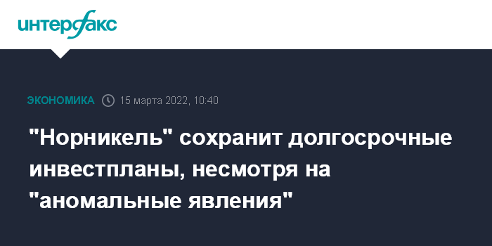 Москва. 15 марта. INTERFAX.RU - "Норникель" , несмотря на аномальные явления на товарных рынках и логистические сбои при поставках продукции, сохраняет все долгосрочные инвестиционные планы и отмечает желание клиентов сохранить контракты.