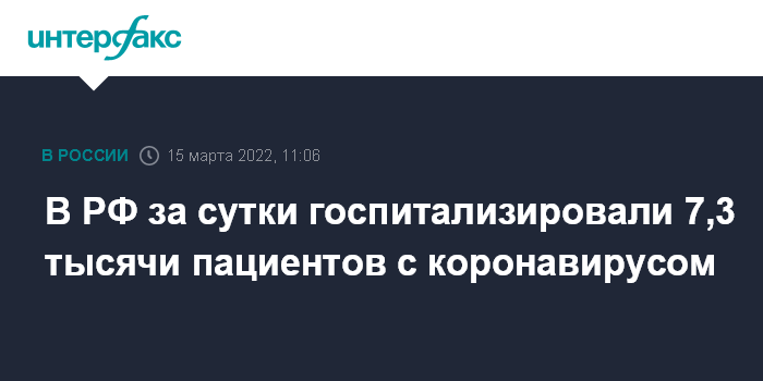 Москва. 15 марта. INTERFAX.RU - За сутки в России в больницы попали 7 273 пациента с COVID-19, следует из данных оперативного штаба, обнародованных во вторник.