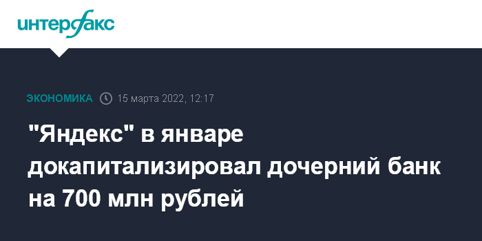 Москва. 15 марта. INTERFAX.RU - "Яндекс" в январе докапитализировал дочерний банк на 700 млн рублей, это следует из информации на сайте ЦБ РФ и базы данных "СПАРК-Интерфакс".