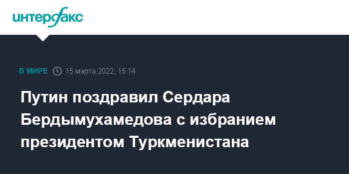 Москва. 15 марта. INTERFAX.RU - Президент России Владимир Путин поздравил Сердара Бердымухамедова с победой на президентских выборах в Туркменистане и отметил, что победа подтверждает его высокий политический авторитет, сообщила пресс-служба Кремля.