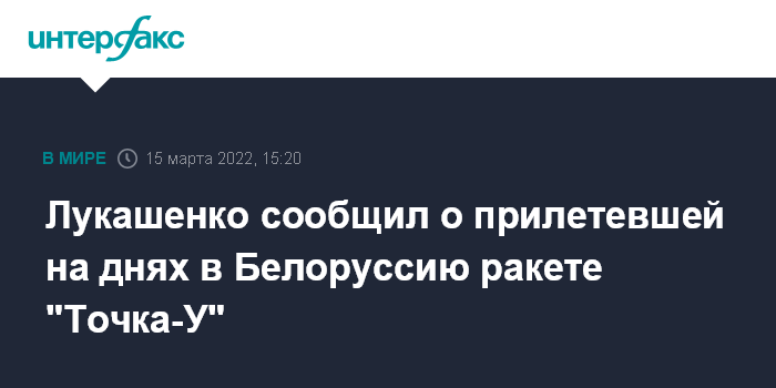 Москва. 15 марта. INTERFAX.RU - Президент Белоруссии Александр Лукашенко заявил, что пару дней назад над Припятью была перехвачена ракета "Точка-У", запущенная по территории Белоруссии.