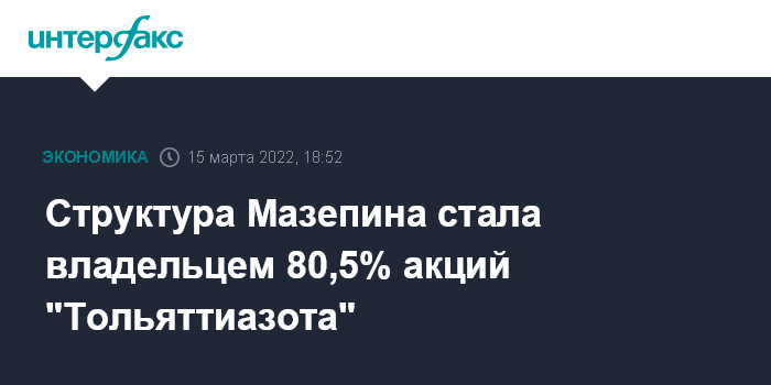 Москва. 15 марта. INTERFAX.RU - Подконтрольное Дмитрию Мазепину АО "Химактивинвест" (Москва) увеличило долю в ПАО "Тольяттиазот" с 9,75% до 80,51% акций, следует из сообщения последнего.