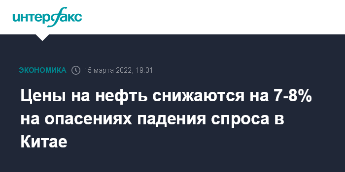 Москва. 15 марта. INTERFAX.RU - Цены на нефть резко снижаются на торгах во вторник на опасениях падения спроса в Китае, где отмечается рост заболеваемости COVID-19.
