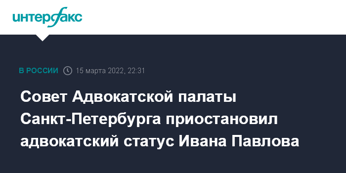 Москва. 15 марта. INTERFAX.RU - Совет Адвокатской палаты Санкт-Петербурга приостановил адвокатский статус петербургского юриста Ивана Павлова (признан в РФ СМИ-иноагентом - ИФ), сообщил "Интерфасу" сам Павлов.