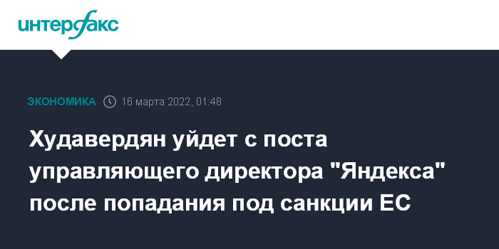 Москва. 16 марта. INTERFAX.RU - Управляющий директор группы "Яндекс" Тигран Худавердян покидает свой пост после того, как был включен в очередной санкционный список Евросоюза, говорится в сообщении интернет-компании.