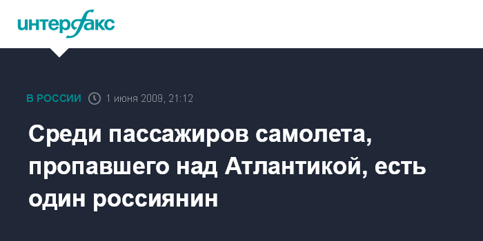 Париж/Бразилиа. 1 июня. INTERFAX.RU - Гражданин России фигурирует в списке пассажиров авиалайнера, пропавшего над Атлантическим океаном, сообщил в понедельник в Рио-де-Жанейро представитель авиакомпании "Air France" Жоржи Асунсау.