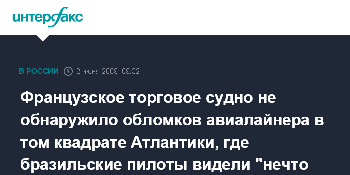Москва. 2 июня. INTERFAX.RU - Французское торговое судно не обнаружило обломков авиалайнера "Эр Франс" в том районе Атлантики, на который ранее указали пилоты бразильской авиакомпании "ТАМ". Они сообщили ранее, что якобы видели во время полета в океане "нечто горящее", сообщает бразильский телеканал "Глобу".