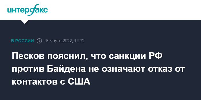 Москва. 16 марта. INTERFAX.RU - Персональные санкции в отношении американских политиков, в том числе президента США Джо Байдена, не означают отказ от контактов, заявил пресс-секретарь президента РФ Дмитрий Песков.