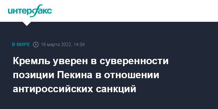 Москва. 16 марта. INTERFAX.RU - В Кремле отметили, что Китай не сгибается под давлением США и занимает сбалансированную, суверенную позицию по вопросу присоединения к санкциям против России.