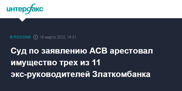 Москва. 16 марта. INTERFAX.RU - Девятый арбитражный апелляционный суд в начале марта частично удовлетворил заявление Агентства по страхованию вкладов (АСВ, конкурсный управляющий), арестовав имущество, включая денежные средства, трех из 11 бывших руководителей московского Златкомбанка.