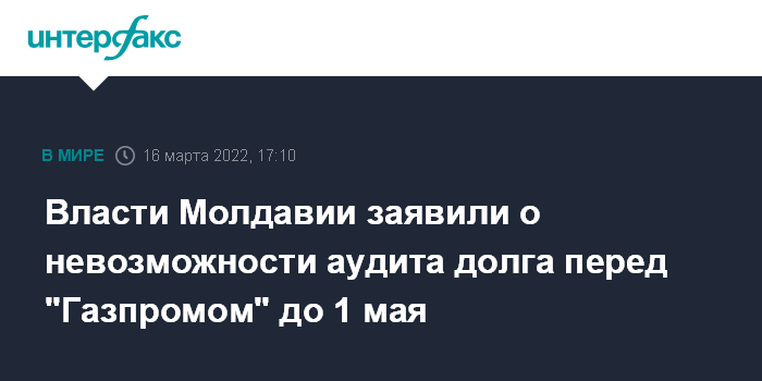 Москва. 16 марта. INTERFAX.RU - Международный аудит исторического долга "Молдовагаз" перед "Газпром" не удастся провести до 1 мая, как это предусмотрено протоколом с российским концерном, сообщила премьер-министр Молдавии Наталья Гаврилица.