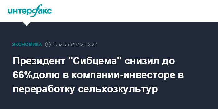Президент "Сибцема" снизил до 66%долю в компании-инвесторе в переработку сельхозкультур