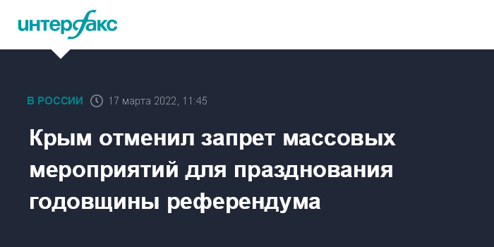 "Действие абзаца первого настоящего подпункта (о запрете массовых мероприятий - ИФ) не распространяется на проведение 18 марта 2022 года в муниципальных образованиях республики Крым митинг-концертов, посвященных Дню Общекрымского референдума 2014 года и Дню воссоединения Крыма с Россией", - говорится в документе, опубликованном на сайте крымского правительства.