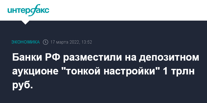 Москва. 17 марта. INTERFAX.RU - Банки в четверг на аукционе, проводившемся в рамках "тонкой настройки", разместили в однодневные депозиты 1 трлн рублей, сообщил ЦБ РФ.