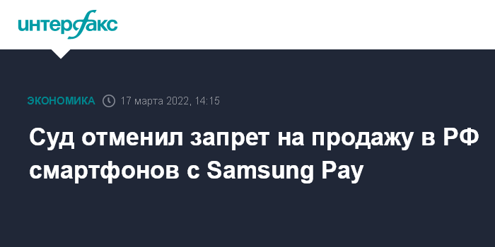 Москва. 17 марта. INTERFAX.RU - Девятый Арбитражный апелляционный суд на заседании в четверг отменил решение о запрете на продажу 61 модели смартфонов с платежным сервисом Samsung Pay в России, следует из информации в картотеке арбитражных дел.