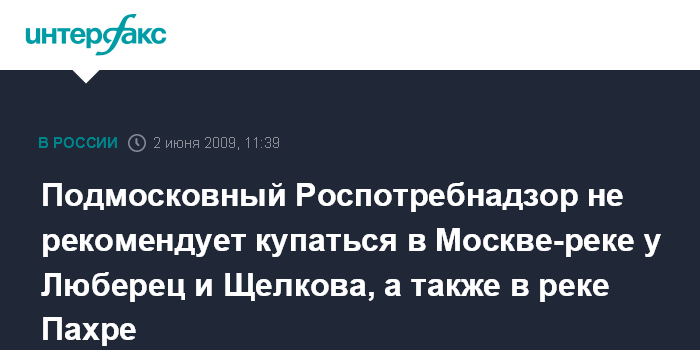 В то же время она отсоветовала купаться в Москве-реке в районах Люберецких очистных сооружений и в районе города Щелково. "Непригодна для купания и река Пахра", - подчеркнула Гавриленко.