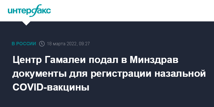 Москва. 18 марта. INTERFAX.RU - Центр имени Гамалеи Минздрава России обратился в Минздрав для получения регистрации интраназальной формы вакцины "Спутник V", соответствующая информация появилась в Государственном реестре лекарственных средств. Факт обращения подтвердил директор центра Александр Гинцбург.