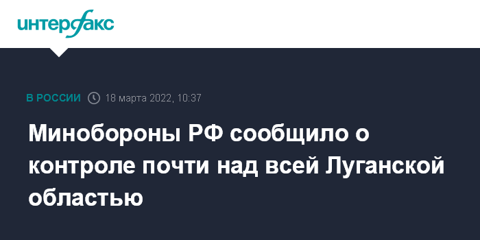 Москва. 18 марта. INTERFAX.RU - Более 90% Луганской области взято под контроль, заявило Минобороны РФ в пятницу.