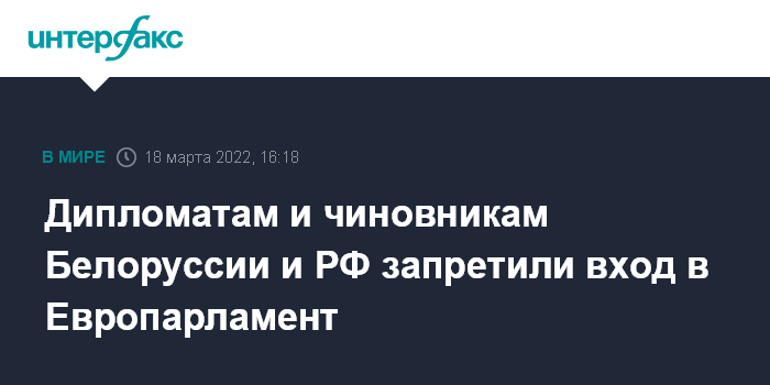 Москва. 18 марта. INTERFAX.RU -Российские и белорусские дипломаты и госслужащие больше не смогут входить в здания Европарламента, заявила президент Европарламента Роберта Метсола.