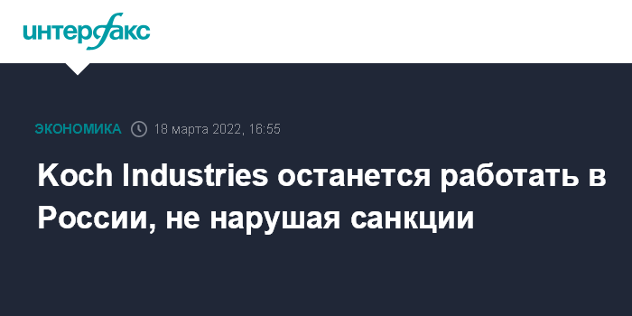 Москва. 18 марта. INTERFAX.RU - Американский промышленный конгломерат Koch Industries Inc. сообщил, что планирует продолжать работать в России, несмотря на то, что в последнее время многие компании сворачивают деятельность в России из-за событий на Украине.