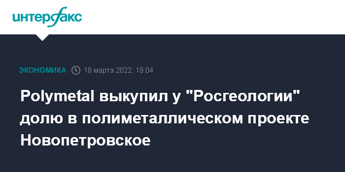 Москва. 18 марта. INTERFAX.RU - Москва. 18 марта. ИНТЕРФАКС - Polymetal выкупил у "Росгеологии" 25% в полиметаллическом месторождении Новопетровское в Башкирии и консолидировал проект, следует из данных аналитической системы "СПАРК-Интерфакс".
