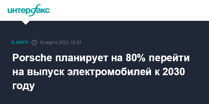 Москва. 18 марта. INTERFAX.RU - Бренд автомобилей класса "люкс" Porsche AG, принадлежащий германской Volkswagen Group, планирует к 2030 году довести выпуск автомобилей на электродвигателях до 80% от общего объема производства, говорится в сообщении компании.