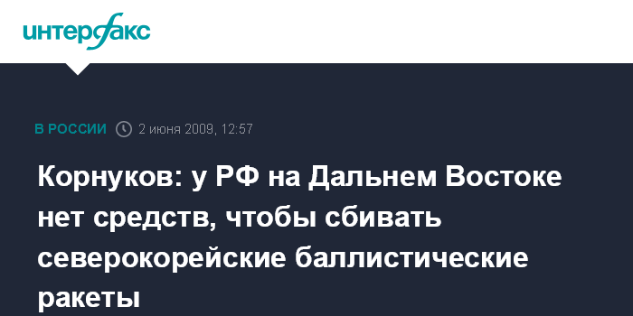 Москва. 2 июня. INTERFAX.RU - Россия не располагает на Дальнем Востоке средствами противовоздушной обороны, способными поражать баллистические ракеты, которые запускает Северная Корея, заявил "Интерфаксу-АВН" во вторник экс-главком ВВС генерал армии Анатолий Корнуков. Он отметил, что, даже если северокорейские ракеты окажутся в воздушном пространстве России, имеющиеся на Дальнем Востоке зенитные ракетные системы С-300 не имеют возможности их уничтожить. "Трехсотка" не предназначена для поражения баллистических ракет и по скорости, и по высоте обнаружения", - сказал Корнуков.